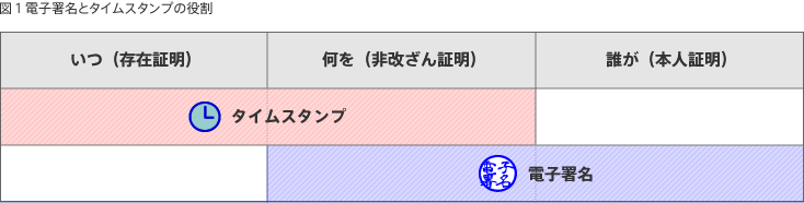 そこで、電子署名にタイムスタンプによる間違いのない時刻での存在証明を組み合わせることで、電子契約で利用する電子契約書に必要な以下の3要件(だれが、いつ、何を)を証明できるわけです。(図1)