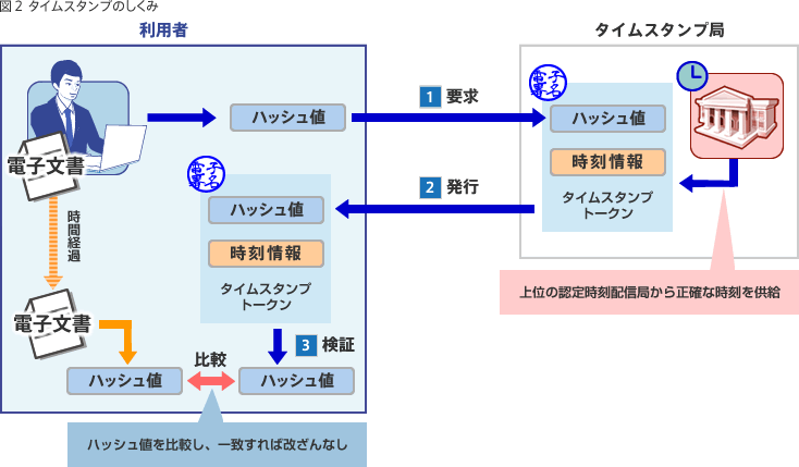 次に、タイムスタンプが存在証明と非改ざん証明を行うしくみをみていきましょう。 図2は、タイムスタンプのしくみを簡単にあらわしています。簡単にいうと、「タイムスタンプを電子文書に付与する」とは、「電子文書のハッシュ値とタイムスタンプ局の発行した時刻情報を結合したタイムスタンプトークンを作成し、タイムスタンプ局がデジタル署名を付与して利用者に返す」ことを意味しています。