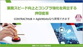 本資料では社内稟議のデジタル化に適したワークフローシステムAgileWorksと電子契約サービスCONTRACTHUBを連携し、社内外の押印業務をデジタル化した際の業務イメージをご紹介します。