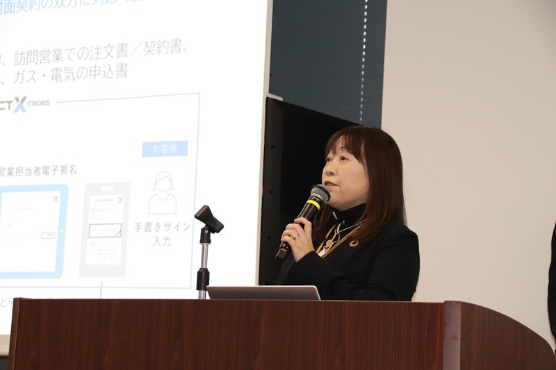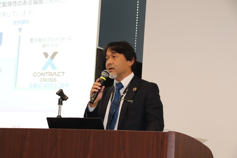 今回のユーザー会では、電子契約の新サービス『CONTRACT CROSS(コントラクト クロス)』についてもご紹介しました。最初に、デジタルソリューション&コンサルティング本部 営業本部の野間 尚子が、「契約のデジタル化による業務効率と信頼性の変革」をキーワードに、CONTRACT CROSSのコンセプトと背景について説明。CONTRACT CROSSでは『N対N』モデルを採用した」と述べ、企業同士が共通環境に参加し、ワークスペースを介して多様な相手と契約データを交換できる仕組みを紹介しました。これにより、サービスオーナー同士や無償ユーザー(取引先)が複数企業と自由に取引できるようになり、従来型の枠を超えた柔軟な契約運用が可能となった点を強調しました。