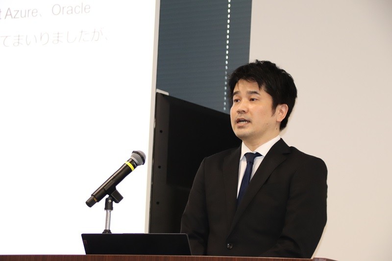 その後、エンタープライズソリューション事業部 アプリケーションサービス第二部の河合 健次が、クラウド基盤の移行について説明。河合は、「従来の自社クラウド『CONTRACTHUB@absonne』から、Microsoft AzureおよびOracle Cloudへの移行を進めている」と述べ、「これにより、負荷変動への柔軟なリソース拡張、セキュリティ強化、国内データ保管の継続など、安定性と安全性が飛躍的に高まる」と話しました。
