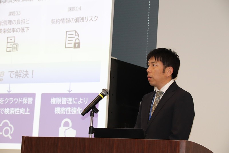 ユーザー事例セッションでは、設備業・工事業の大手である株式会社 ユアテック様 経営企画部 IT 戦略 システム企画グループ 課長の佐藤 元孝様、係長の佐々木 泰一様が登壇し、DX推進の取り組みと電子契約の活用について紹介されました。ユアテック様では、2022年度から本格的なDX推進会議を設置し、工事量の増加や働き方改革への対応、業務プロセスの最適化といった課題に向き合ってきました。その中で、契約業務のデジタル化に着手し、CONTRACTHUBと基幹システムをAPI経由で連携。年間約7万件に及ぶ契約・請求業務を電子化することで、協力会社約1700社が電子契約を利用する体制を構築しました。