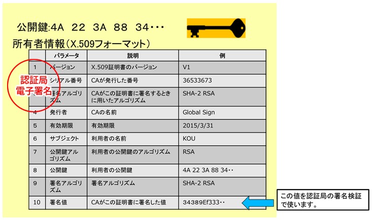 公開鍵が間違いなく本人のものであることを認証局が証明するための証明書。公開鍵証明書ともいう。本人の情報と公開鍵などからなるX.509規格に認証局が電子署名を付与したもの