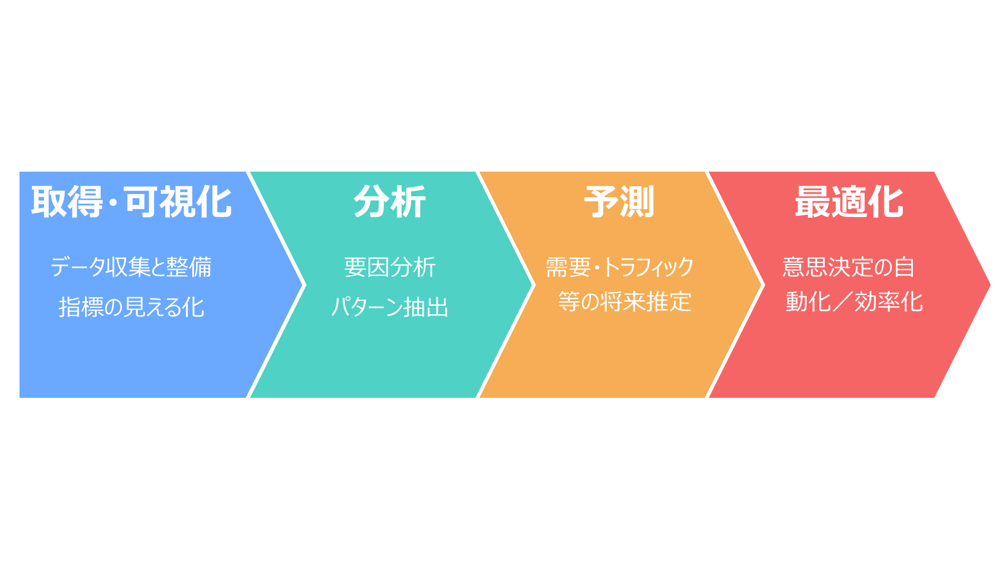 ビジネスにおけるデータの利活用は「取得・可視化」→「分析」→「予測」→「最適化」のステージがあります。
