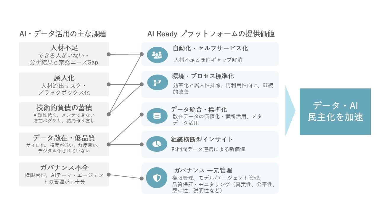 AI内製化は、業務担当者自身、つまり市民データサイエンティストがAIを構築する体制を指す。 データサイエンティスト不足という制約を乗り越え、現場のニーズに即応できる機動力を獲得する。 スピードと実用性が両立し、「現場で本当に使えるAI」が生まれる土壌となる。