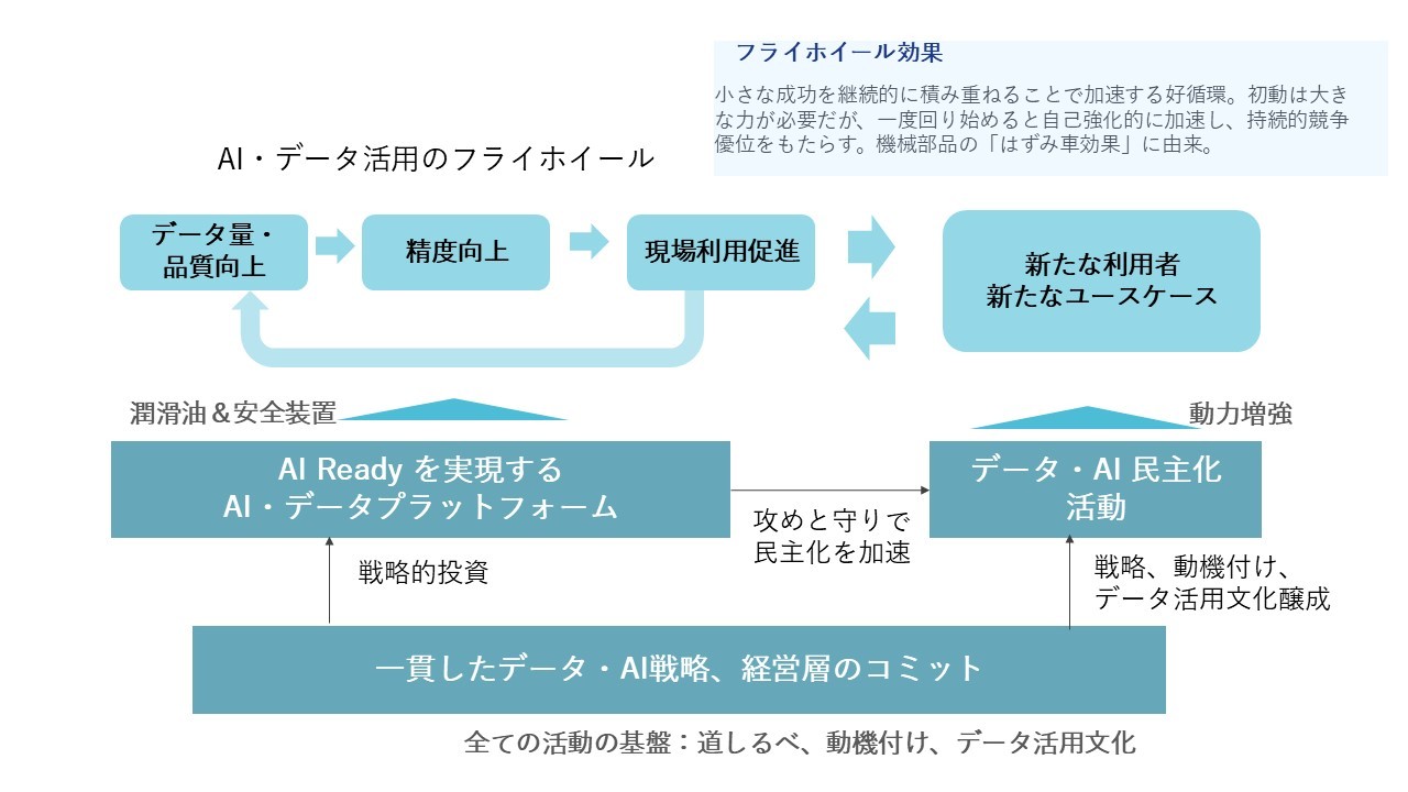 質の良いデータを使って、精度が良く信頼性の高い予測モデルができれば、現場の活用が促進される。これをAI プラットフォームで効率化する。 Auto ML AIプラットフォームを前提とした、AI 民主化の活動の中で専門のデータサイエンティストと市民データサイエンティストが協力することで、新たなユーザーが育ち、新しいAIユースケースを生み出していく。 AI ユースケースが生まれれば、データが蓄積され、さらにAIの現場適用が進んでいく。 筆者はこれをAI・データ活用のフライホイール効果(弾み車のような好循環)と呼んでいる。 もちろん、全ての前提はAI戦略と経営のコミットメントである。