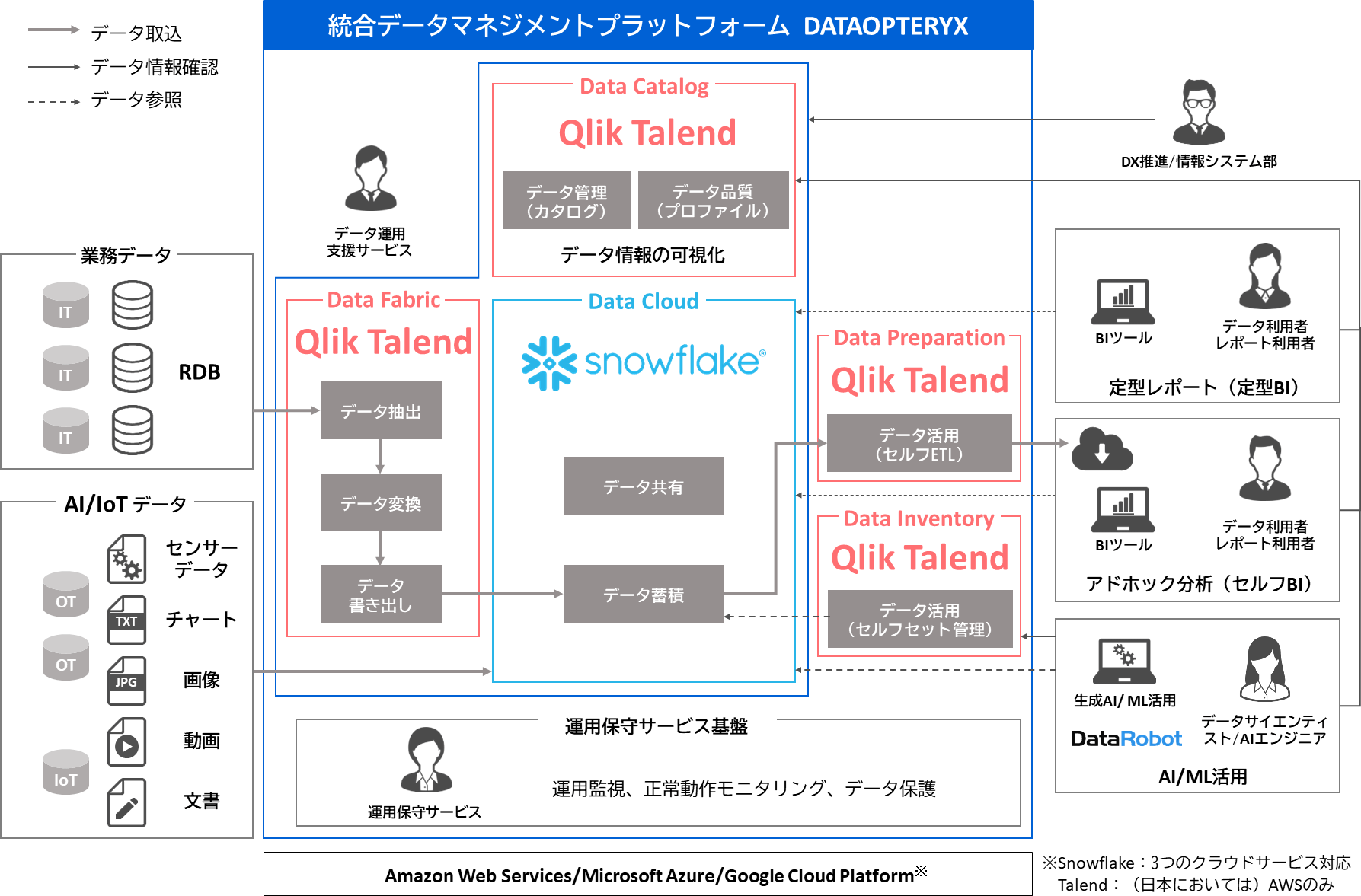 エンタープライズレベルで複数のSaaSを組み合わせご利用いただく場合、運用・セキュリティの両面を考慮した設計や検証が必要になり、データの収集や活用を開始するまでに長い準備期間を要します。弊社では、データマネジメントプラットフォームであるQlik TalendとデータクラウドプラットフォームであるSnowflakeを組み合わせた上で検証を行った統合データマネジメントプラットフォーム(DATAOPTERYX)をお客様にご提供することにより短期間でのプラットフォーム立ち上げが可能です。DATAOPTERYXは、ガバナンス強化と迅速な全社データ利活用を可能とし、お客様のデータドリブン経営の実現に寄与します。