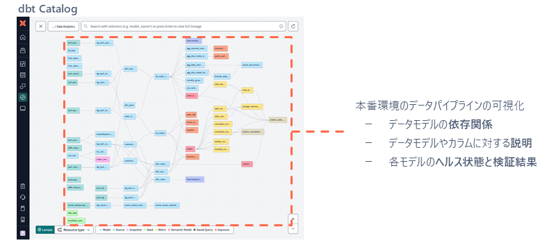dbtは、モデル間の依存関係を自動で解析し、DAGとして可視化することで、どのデータがどこから来てどこへ流れていくのかを直感的に理解できる環境を提供します。この可視化された構造は、Explorerを通じて誰でも確認でき、上流の変更が下流にどのような影響を与えるかを素早く把握することが可能になります。また、データ活用者にとっても、データセットの意味や由来が明確になるため、分析の正確性とスピードが大幅に向上します。
