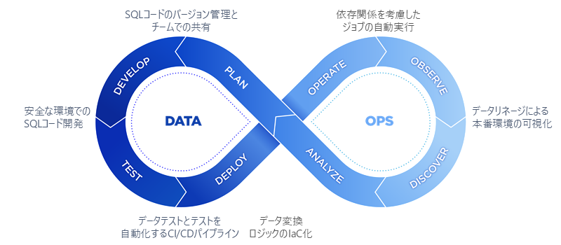 dbt Cloudは、ブラウザだけでSQLとJinjaを使った開発が完結するIDEを提供し、コードの実行結果やコンパイル後のSQLを即座に確認できます。Gitとの連携によってレビューやデプロイも標準化され、開発からリリースまでのサイクルが高速化します。また、クラウドDWHの並列実行やスケーリングといった性能を最大限に活かすことで、モデルの実行時間も最適化され、分析チームはより多くの試行を短時間で繰り返せるようになります。
