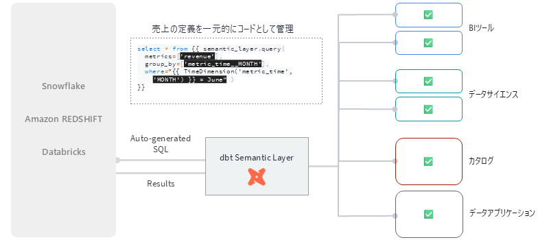 dbtは、モデルの説明・スキーマ・依存関係などを含むドキュメントを自動生成し、Explorerのインターフェイスから検索・参照できる状態で提供します。これにより、担当者が変わってもデータの意味や構造を簡単に理解でき、組織全体で“同じ定義”のもと分析が行えるようになります。さらにSemantic Layerを利用することで、メトリクスを一元管理し、「誰がどこから集計しても同じ値が返ってくる」状態が実現し、データの信頼性と再利用性を飛躍的に高めます。