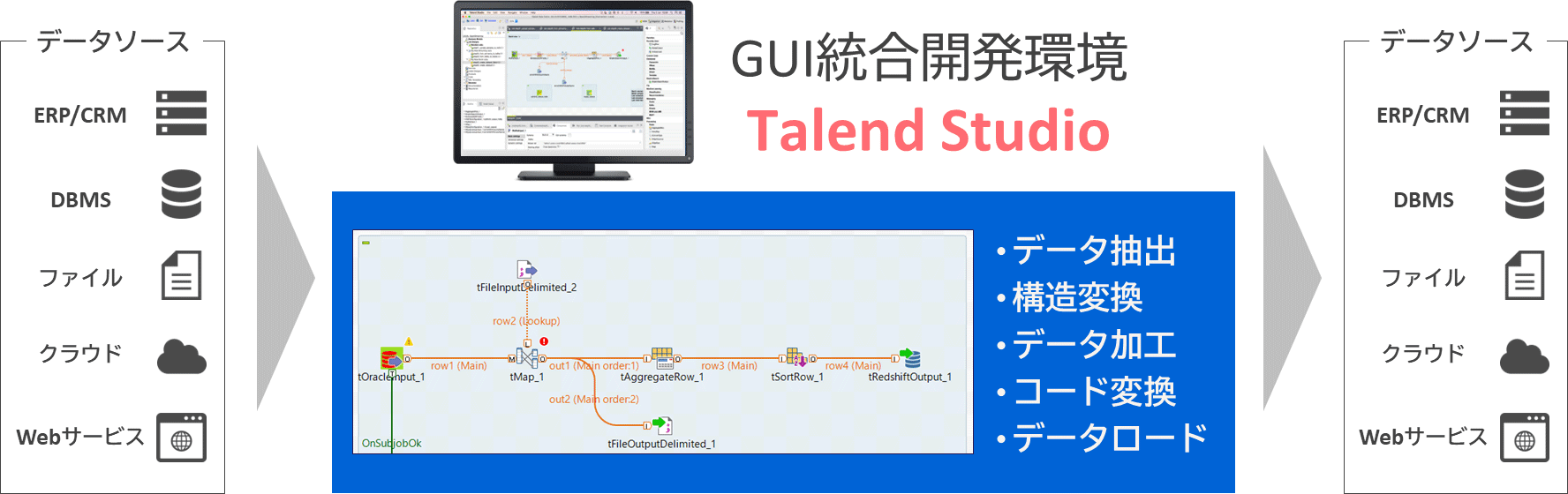 GUIベースのデータ統合/データ連携開発環境で、機能別部品を接続するシンプルな操作性によりデータ統合のフローを容易に開発。データ統合の様々な局面をサポートする充実した機能、開発とデバッグの同時進行、仕様書やテストの自動生成といった支援機能が豊富。