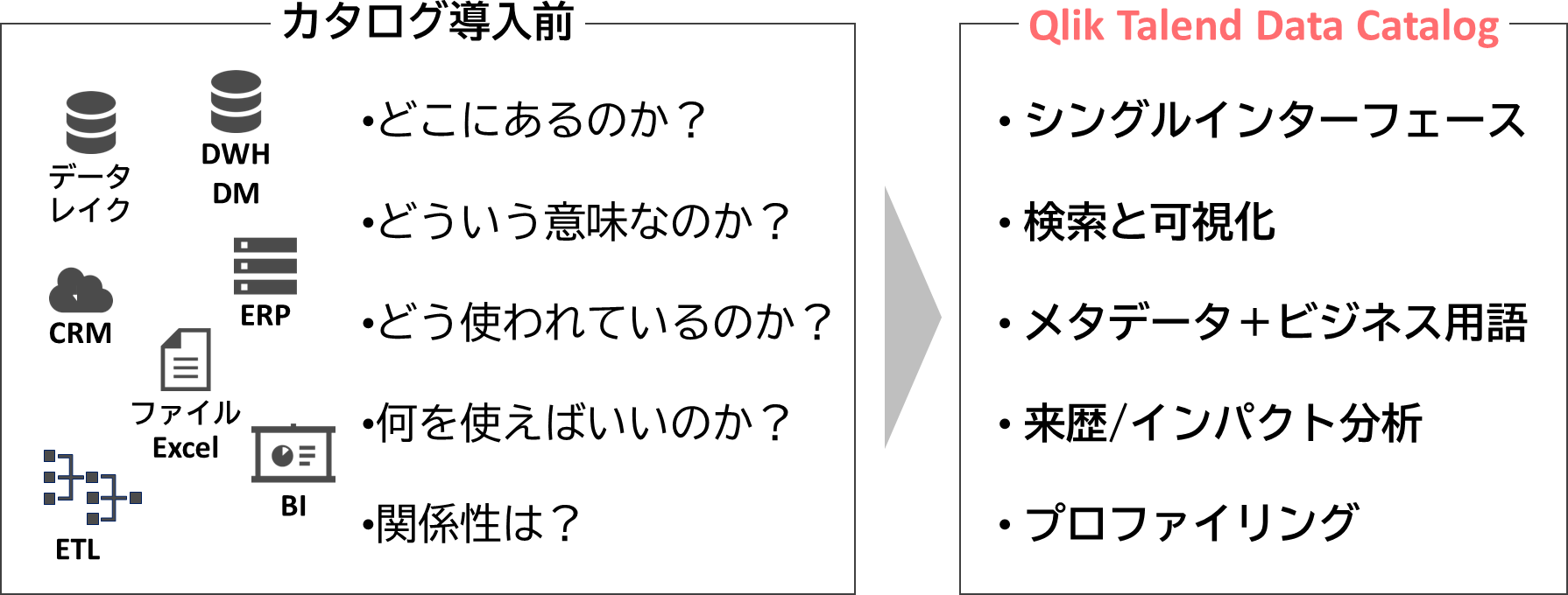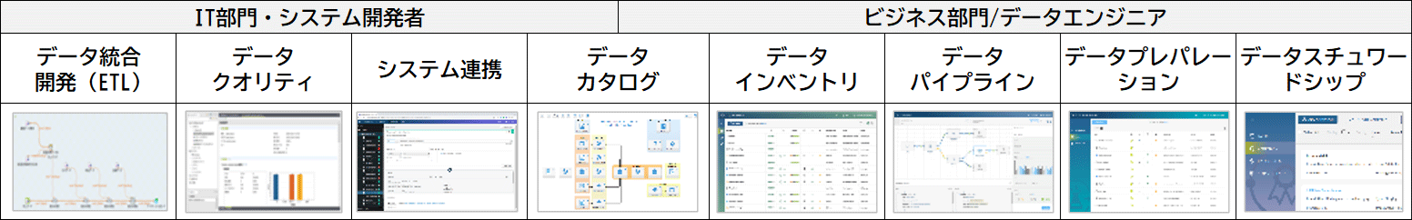 多種多様なデータが乱立する、いわゆるデータカオスを解決しデータを統制します。また、様々な社内のデータ利用者のニーズや役割・ユーザー特性に、用途別アプリケーションを多角的に提供し、データ利活用の生産性を向上します。