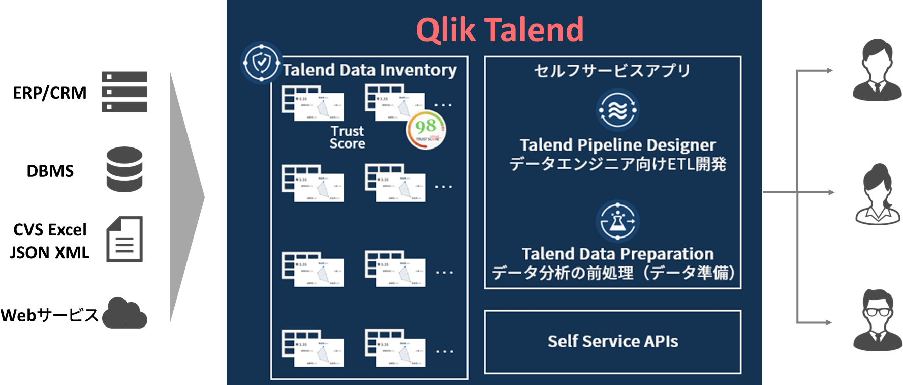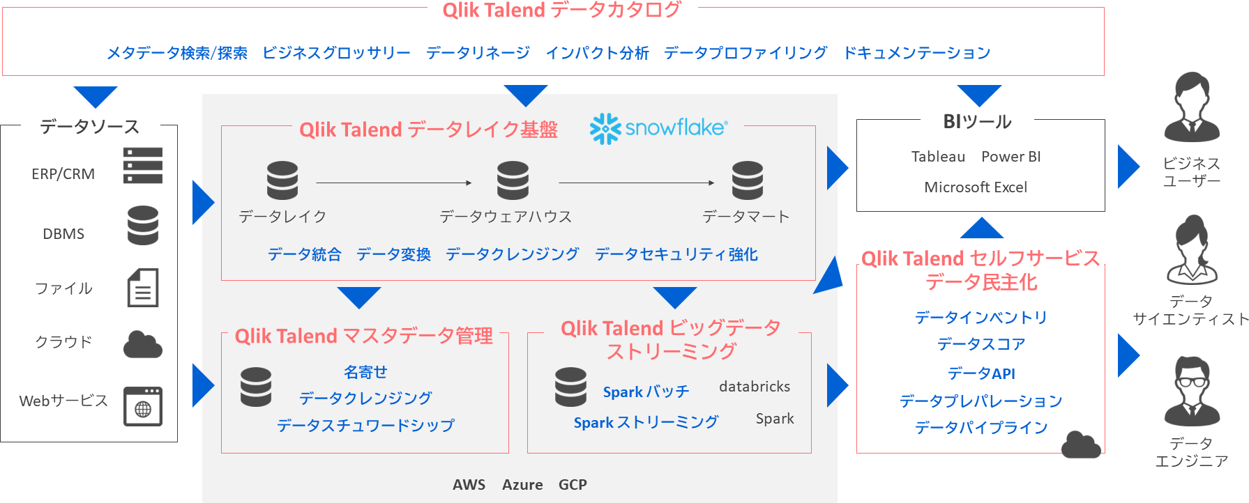 Qlik Talendはデータ活用の様々なニーズに対応する統合データマネジメントプラットフォームです。オンプレミス、SaaS、ハイブリッドと多様な構成が可能であり、お客様の重要なデータをクラウドに上げることなく様々な処理・加工を行うことができます。ETLやデータカタログとしての活用に加え、データガバナンスやセルフサービスによるデータ利活用ニーズにも応えます。多様なデータソースやクラウドサービスとの連携が容易であり、大規模エンタープライズのデータ利活用基盤のデータフロー全体を効率的に統制管理することができます。