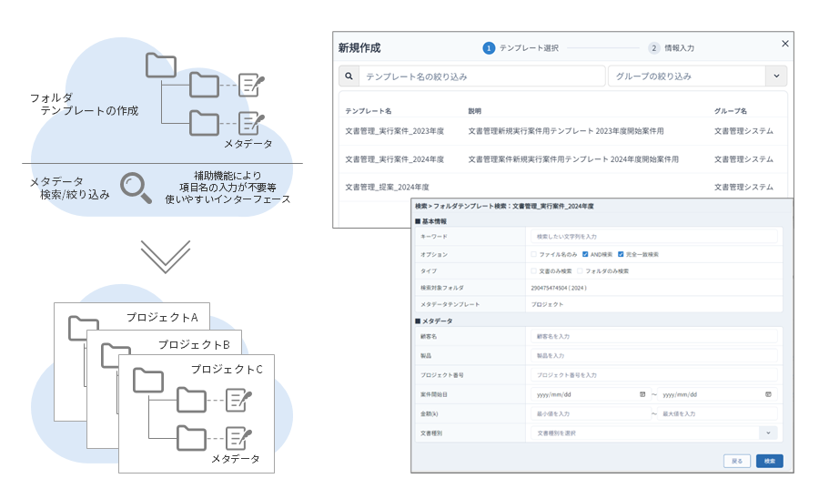 文書管理のユーザインタフェース(データ登録画面)を提供し、お客様のルールに則った案件管理や電子データの保存対応が可能です。