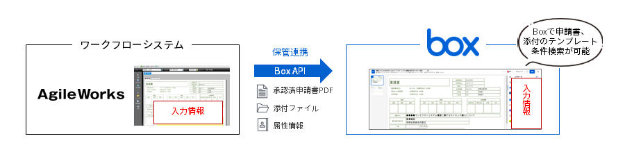 AgileWorksで承認が完了した申請書および添付ファイル一式を、自動的にBox上にアーカイブすることが可能です。