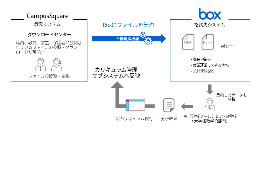 教務システムCampusSquareとBoxを連携させることで、学内に点在する様々な申請書や授業運営に関する情報、統計データなどをBoxに集約し、物理ファイルの一元管理を実現します。また、Boxを利用することで、保存された情報を簡単かつ安全に共有できます。