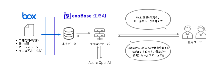 exaBase生成AIとBoxを連携させることで、Box上に自社データを登録し、そのデータを活用した自社向けのチャットAIサービスを構築することが可能となります。