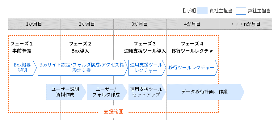 Box導入時には、30年以上に渡って文書管理ソリューションを提供してきたNSSOLならではの支援として、お客様のポリシーや運用に合わせたフォルダ構成/アクセス権設定のご提案が可能です。また、システム管理者の負荷を軽減する運用支援ツールや、既存からBoxへのデータ移行を支援する移行ツールなどもご提供しております。