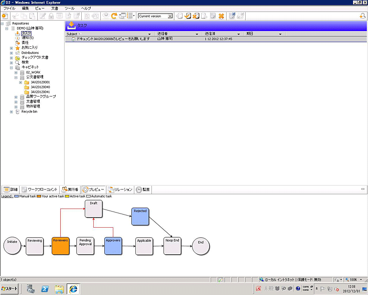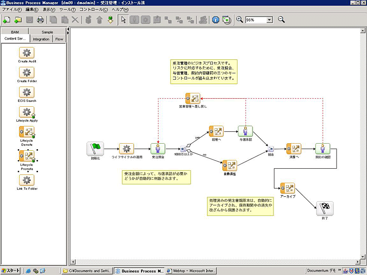 | 例外的な処理に対して、コメント機能や内外の関係者とemailでやり取りできます。これらはすべてDocumentum上で証跡として保存されます。 |