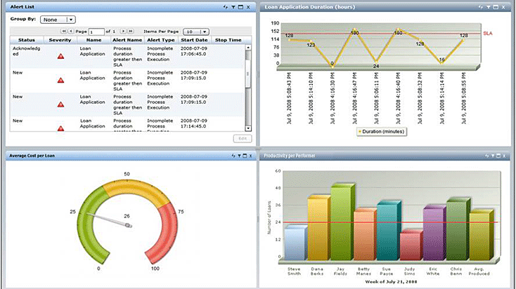 Business Activity Monitorは、業務の見える化を行うための対話式ダッシュボードです。主要な指標を定め、それらを統計的あるいは個別に可視化でき、アラートを発して、事前に定めたアクションを実行することができます。これらの機能によって業務にともなう様々な問題を未然に防ぐことが可能です。