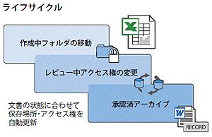 OpenText Documentumは文書の作成から破棄されるまでの状態を保持し、管理できます。状態に応じたアクションを設定でき、たとえば文書の状態の遷移と同時に保存先を変更する、あるいはアクセス権などの属性を自動的に変更するといった設定が可能です。
