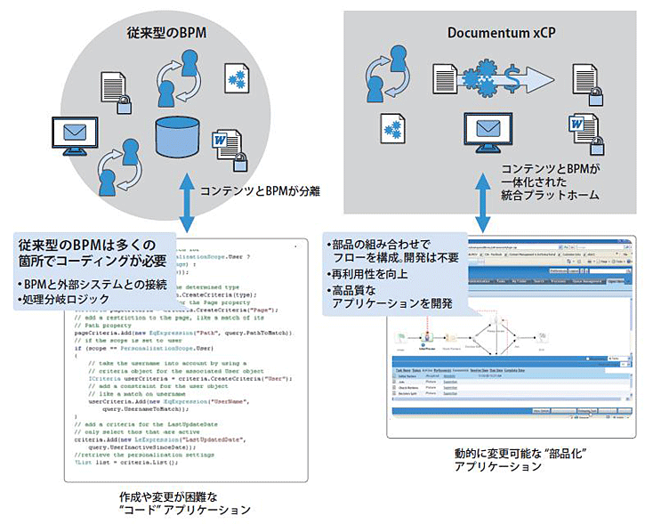 従来のBPMでは、ドキュメント(コンテンツ)とBPMが独立しているため、複雑なコーディングを必要としました。