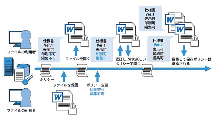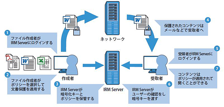 たとえば、ファイル制作者がIRMサーバーにログインし特定の人に対して「ファイルの閲覧」というポリシーを設定します。その設定情報及び暗号鍵がIRMサーバーに保管され、ファイルは暗号化されロックされます。このファイルをEメールなどで閲覧する権限を持つ人に送信すると、その閲覧者はファイルを開くときは必ずIRMサーバーに接続し、ポリシーが自動定期に照合されます。照合の結果、閲覧する権限を持っていることが確認出来れば、IRMサーバー上に保管されている鍵が閲覧者に送信されファイルが復号されて閲覧できます。