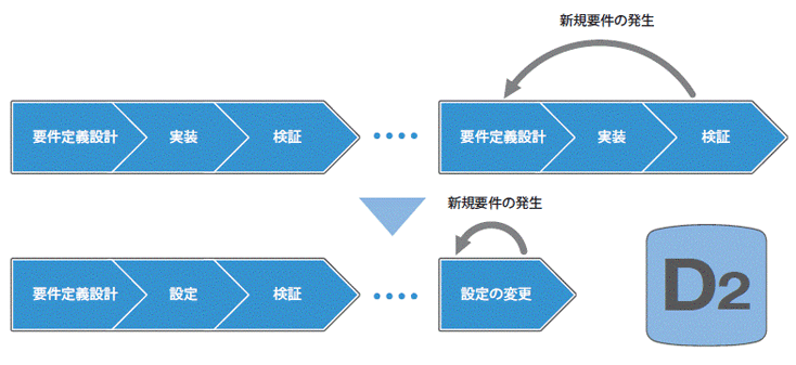 OpenText Documentum D2はコーディングを必要とせず、設定だけで業務に必要な機能や画面を作成できる新世代のシステム構築ツールです。そのため、短期間でECMの運用を開始できます。