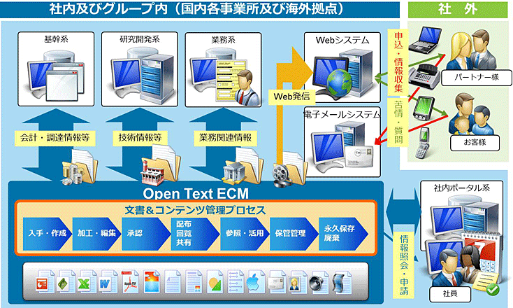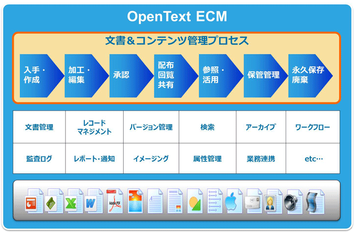 OpenText Content Suite Platform(OpenText CSP)は、文書やコンテンツの作成から保管/破棄までのライフサイクルを管理する包括的なエンタープライズコンテンツ管理(ECM)基盤です。企業内にある様々な文書やコンテンツなどの情報を収集し、ポリシーに応じて自動分類し、あらゆる環境からの柔軟なアクセスと情報の活用を支援する強力な情報ライフサイクル管理を可能にします。また、一連のライフサイクルをセキュアに管理・共有でき、様々な環境に適した直感的なインターフェースと、あらゆる証跡を記録する高度なレコード管理と監査機能、ERPや他業務システムとの連携など企業内の情報ガバナンスを高めるための機能を備えています。