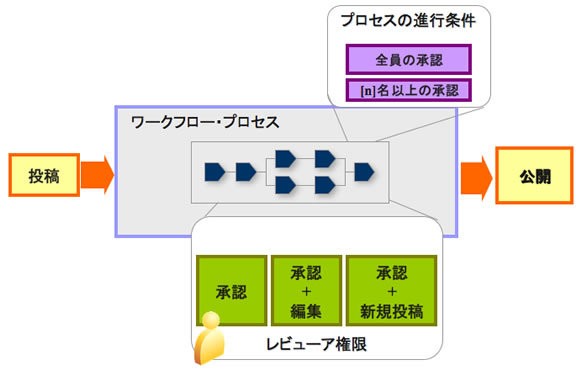ドキュメントをチェックインすると、その属性にあわせて自動的に承認ワークフローが起動します。承認者への通知はメールで行われます。承認終了後、ドキュメントのステータスが公開になります。複雑なワークフローの設定はスクリプトを利用できます。
