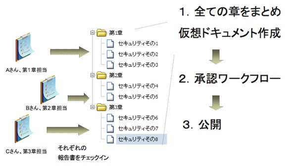 別々に作成された複数のファイルをひとつの仮想ドキュメントとして管理することができます。例えば章別に異なる人が作成した報告書を、ひとつの仮想ドキュメントとしてスナップショットを作成し、バージョン管理をおこなったり、ワークフローで承認したりすることができます。