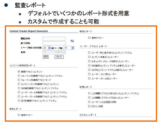 ユーザーごとのコンテンツへのアクセス状況、コンテンツごとにどのユーザがアクセスしたかなど様々な監査レポートを作成可能です。
