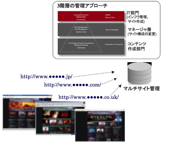 本格的なCMSをオプションとして実装しています。国別や、事業部別などの複数のWebサイトを統一感をもたせ一元的に管理可能なマルチサイト管理が特徴です。コンテンツの作成、サイト管理、サイトの構成管理を分離し、3階層で管理するアプローチにより、効率的なサイトの更新をバックアップします。