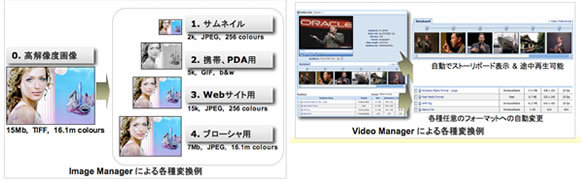 イメージやビデオ、オーディオなどのデジタルコンテンツの変換や保存、検索、閲覧から再利用までを簡単かつスピーディに行えるソリューションです。Webサイトや印刷などのさまざまな用途で利用されるイメージやビデオを、適切なサイズや解像度に変換、圧縮するなど、再利用性を高める作業を支援します。