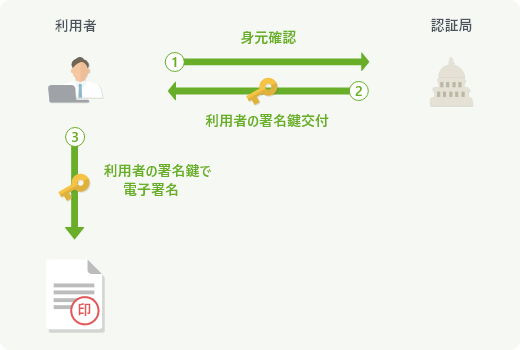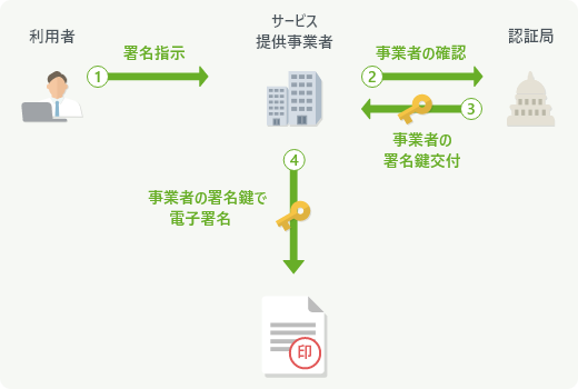電子署名には当事者型と事業者署名型(立会人型)の2種類があります。当事者型電子署名とは、利用者が認証局による身元確認と署名鍵の交付を受け、交付された本人の電子証明書を利用して電子文書に電子署名を行う方法です。事業者署名型電子署名とは、利用者がサービス提供事業者に電子署名の指示を行い、その利用指示に基づいてサービス提供事業者が事業者自身の電子証明書を利用して電子署名を行う方法です。