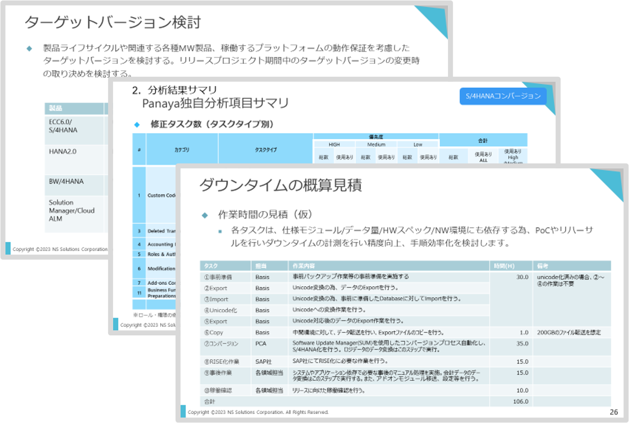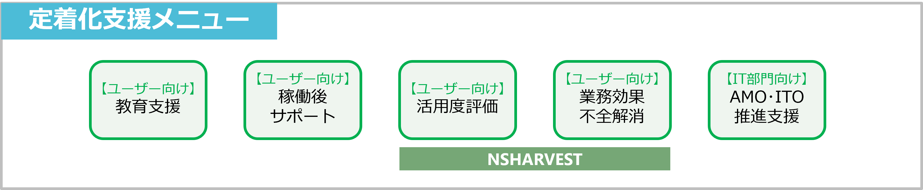 NSSOLは「NSHARVEST」という基幹システム稼働後の評価や、効果の刈り取りを支援するためのサービス・メソッド(別途有償)を有しており、アップグレード後の新業務定着化の際には適宜このサービスを適用し、SAPシステムの活用度合の評価や改善活動を個別案件として切り出し、定着化をご支援することが可能です。