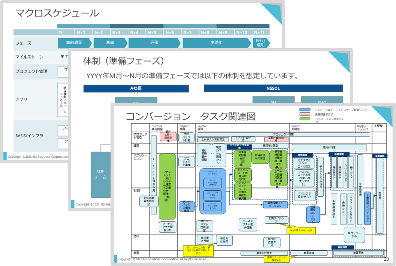 ビジネスアップグレードのプロジェクトは、NSSOL独自の導入スキームである「NS ACTIVATE」に従い、円滑に実行されます。