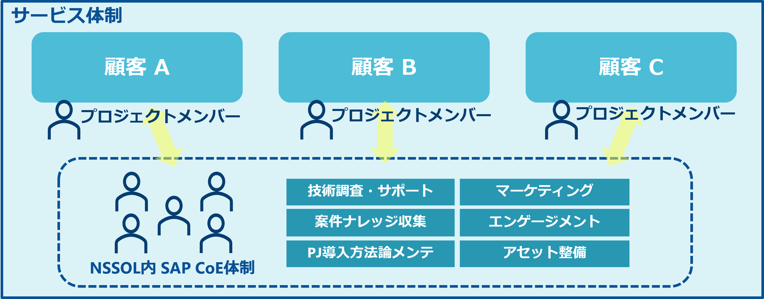 「ビジネスバージョンアップ」のプロジェクトを進めるにあたり、NSSOLのSAP CoE体制を通じて、技術調査やナレッジ提供などをサポートいたします。
