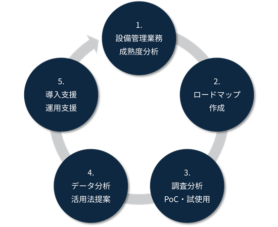 多くの鉄道業務システムに携わってきた私たちだからこそ、一緒に着実に、5つのステップで設備管理DXを進めます。