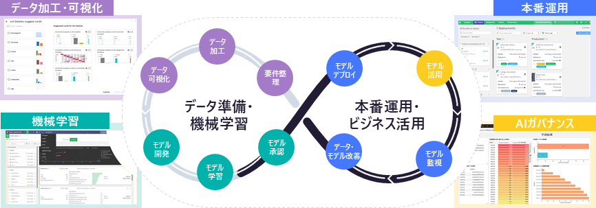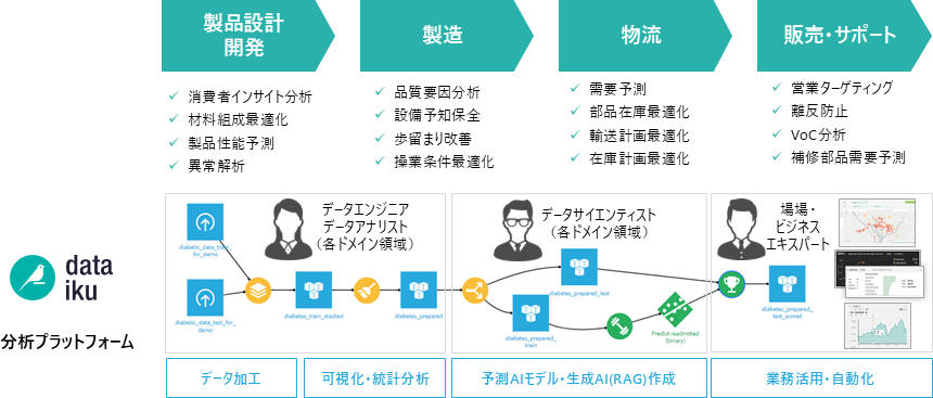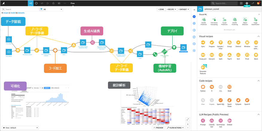 Dataikuはデータ準備・可視化・統計分析・機械学習・運用にわたるすべてのプロセスに必要な機能が統合されています。