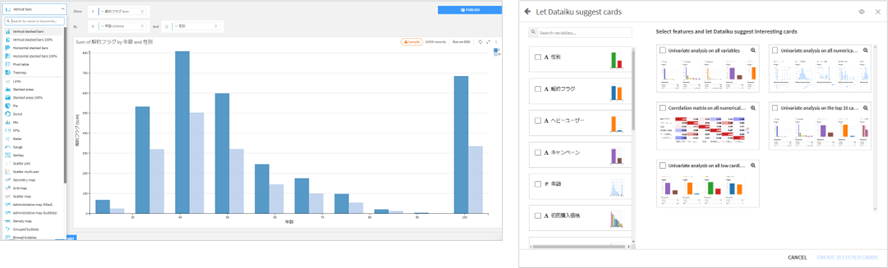 AI・データ分析においては可視化によるデータの傾向把握、データ同士の関係を明らかにする統計解析が必要になります。Dataiku上でデータを加工しながら、ドラッグ&ドロップによるグラフの作成や変数同士の相関・分布を確認する統計分析を行い、データの理解を深めることができます。統計分析においては目的に応じて必要な手法を提案してくれます。