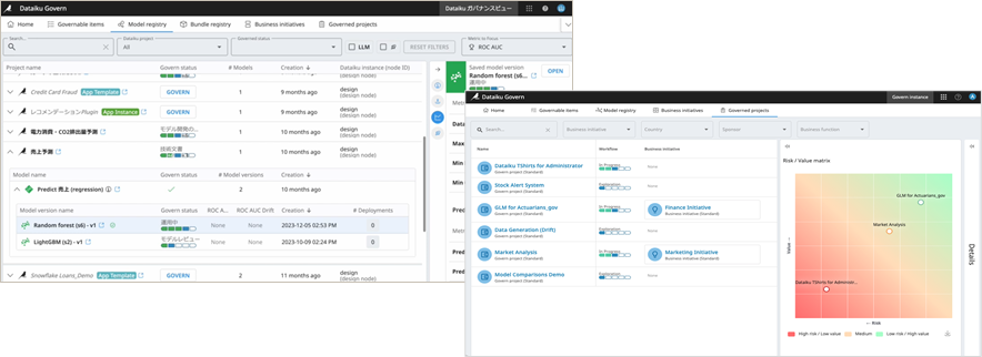 モデルパフォーマンスに加え、ガバナンスルールにもとづくモデル開発の承認プロセス・アクセス制御・データカタログ管理・コラボレーション開発における変更履歴の管理をビジュアル画面上で実現。
