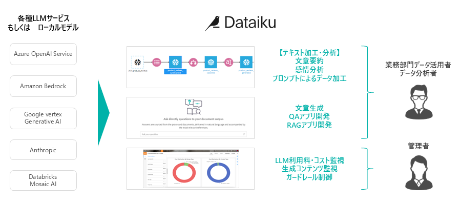 Dataikuはプラットフォームとして機能し独自の生成アルゴリズムは持ちませんが、各種LLMサービスと接続することができます。