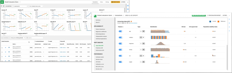 機械学習モデルは一度開発したら終わりではなく、継続的なパフォーマンス監視が必要になります。Dataikuは本番運用中の機械学習モデルの監視ログを自動収集し、各種パフォーマンス指標(精度品質・データドリフト・性能ドリフト)を時系列でモニタリング。機械学習モデルの維持・更新に必要な意思決定を支援します。