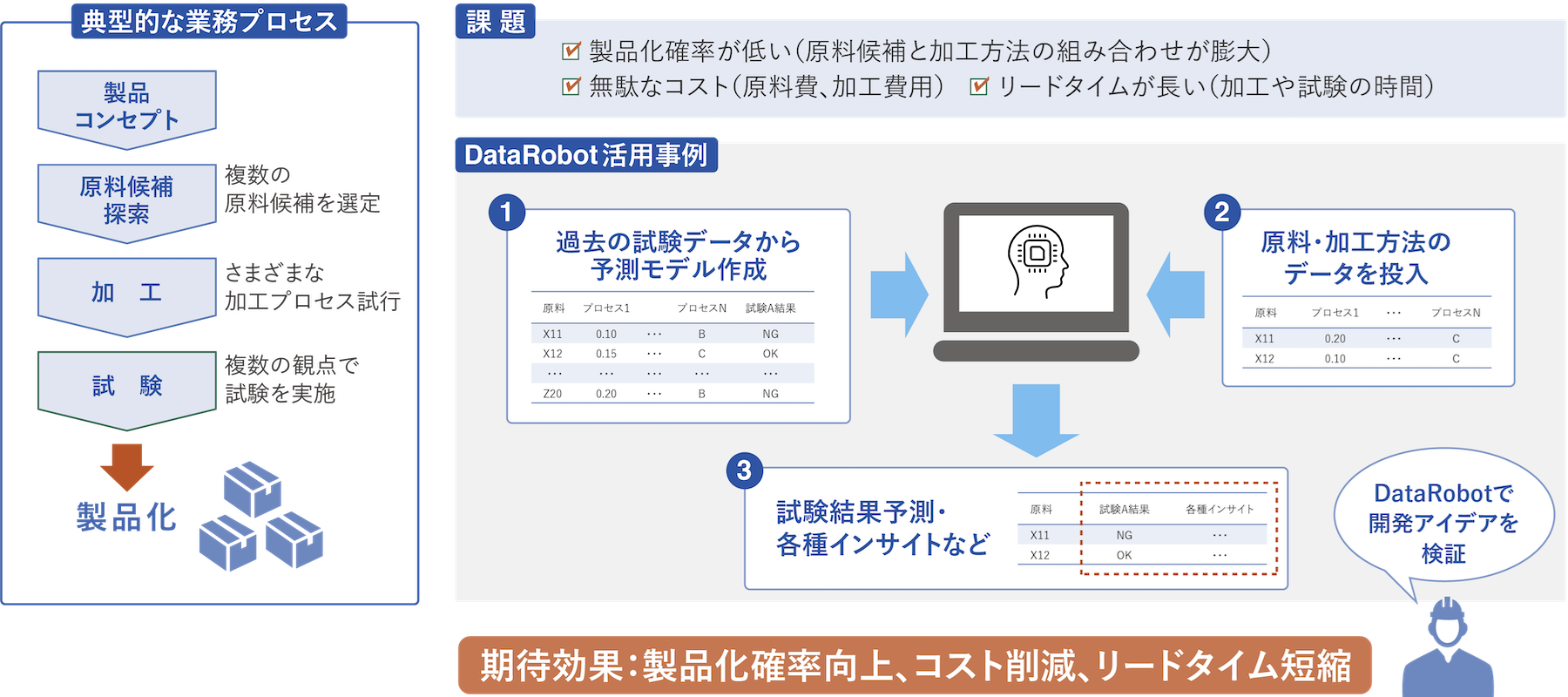 研究開発プロセスにおけるAI/機械学習の活用は近年その重要性を増しており、材料開発の領域も例外ではありません。過去の多数の実験データを基に作成されたAI/機械学習モデルにより原料候補の探索を行うとともに、最適な加工方法を提示します。