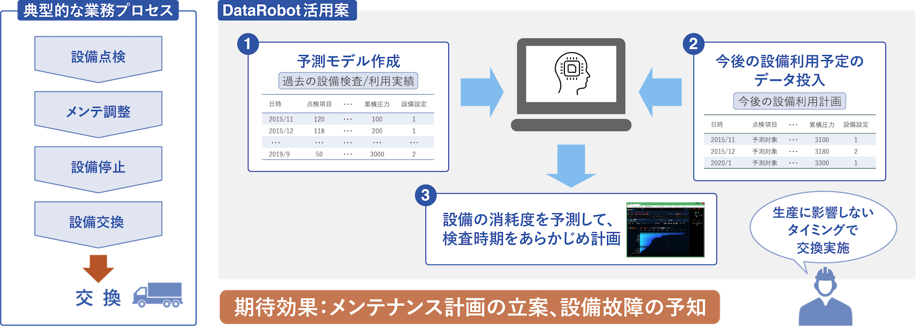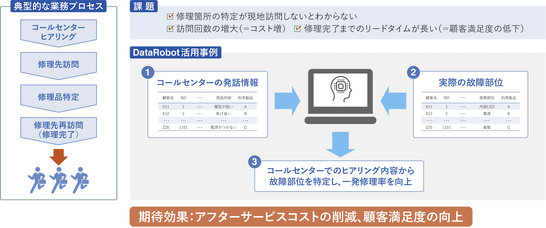 客先で稼働している製品からIoTの仕組みを通じて送られてくる稼働データを学習することで、製品の異常検知や起きそうな故障の予測ができます。また、IoTが導入されていない場合も、コールセンターでヒアリングした内容と実際の故障部位の相関関係を長期間にわたって学習させることで、あらかじめ故障部位を特定した上で現地を訪問し、的確なアフターケアを提供することが可能となります。