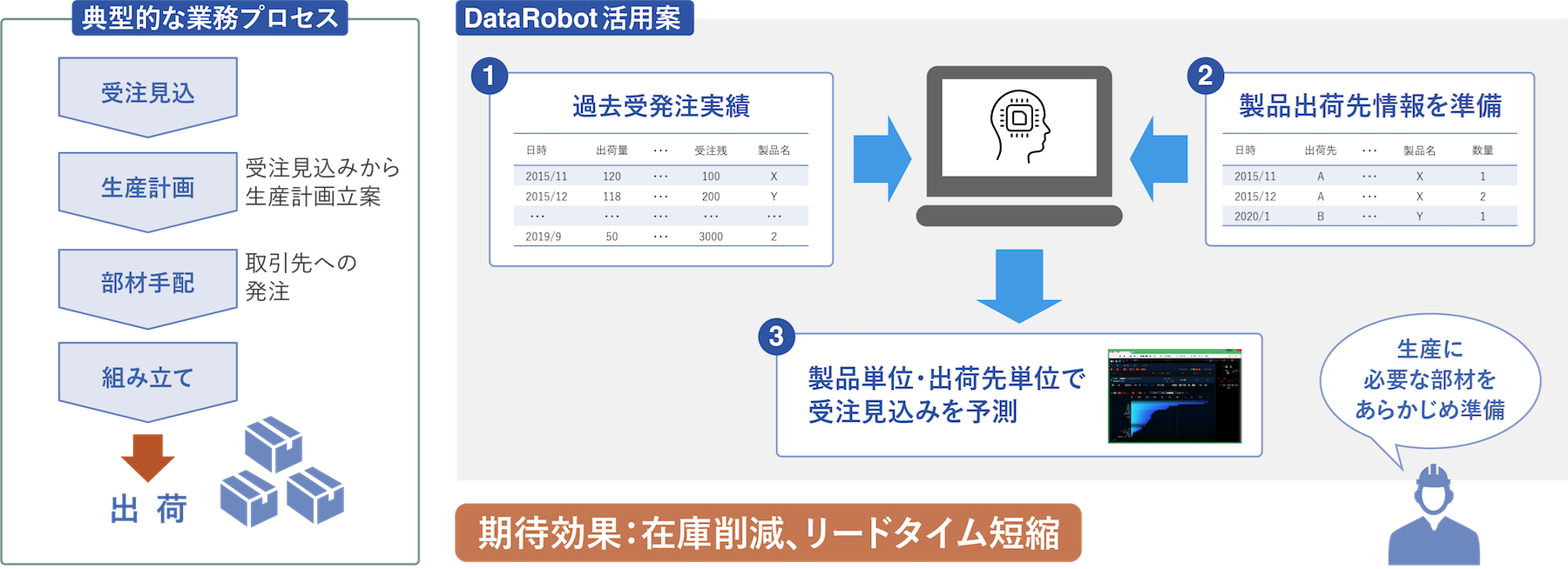 過去の生産実績データとマクロ経済の情報を取り込むことで、高精度な需要予測を行うAI/機械学習モデルをほぼワンクリックで作成可能です。この予測結果を生産計画やサプライチェーン管理などのシステムと連携させることで、無理や無駄のない最適化した生産を実現します。