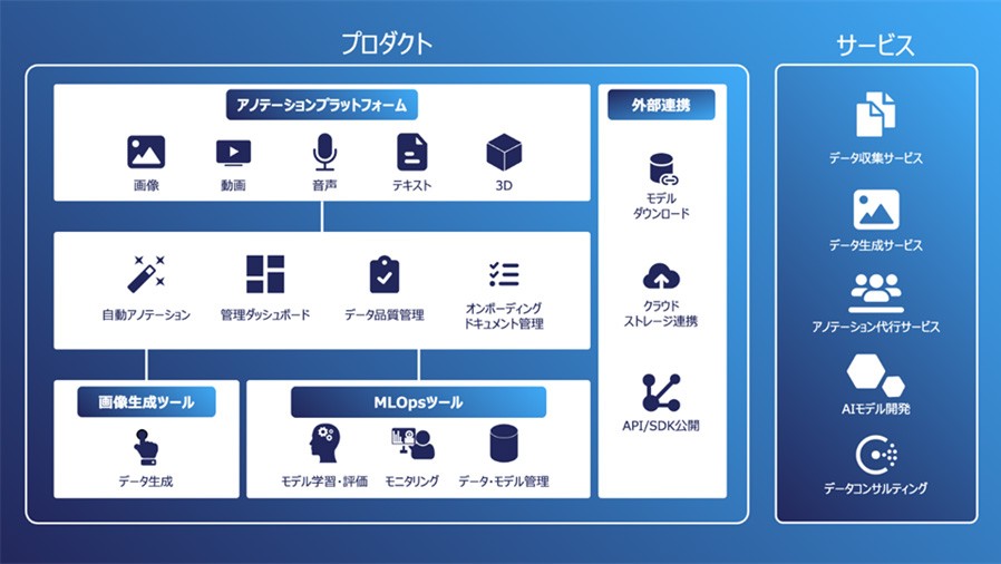 FastLabelは、AIモデル学習の前処理であるアノテーション作業効率化を実現する製品です。スマートアノテーション、自動アノテーション機能等によりアノテーションの効率化を実現しており、データ生成、データ選別、自動アノテーション、モデル管理、モデル学習、モデル評価、デプロイ、モニタリング、パフォーマンス監視を一気通貫で実行することができるSaaS版のプラットフォームです。