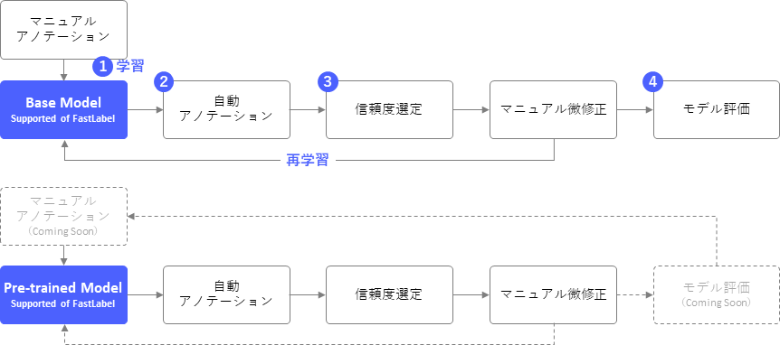アノテーションを行ったデータを用意し、ベースモデルを指定することでAIモデルの作成が可能です。AIモデルは自動アノテーションに使用したり、デプロイしてその後の実業務での運用に活用したりできます。