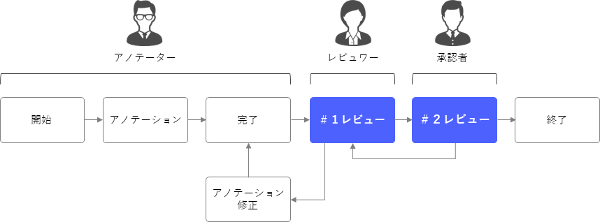 アノテーターがタスクを完了させた後、レビュワーと承認者がレビューを行うワークフローを設定可能。